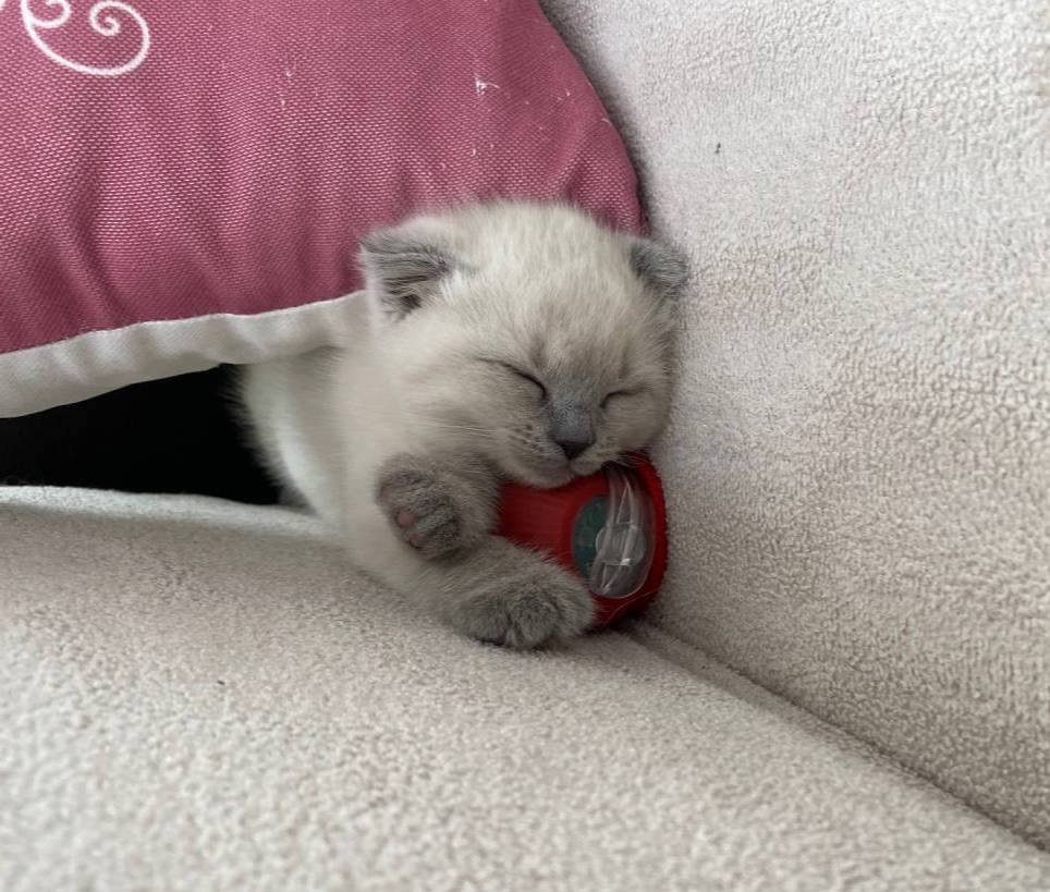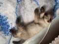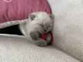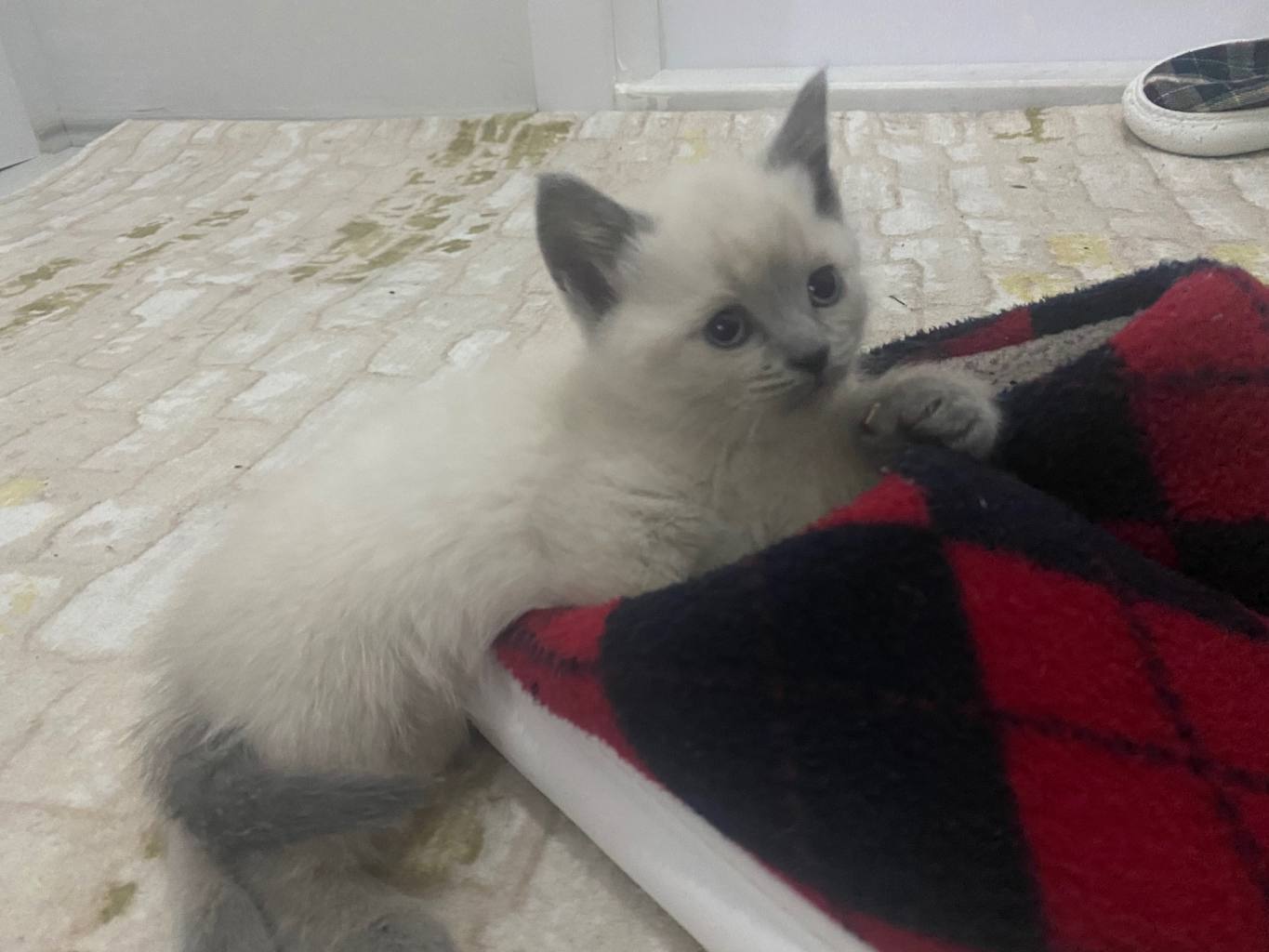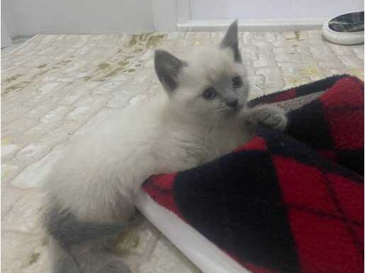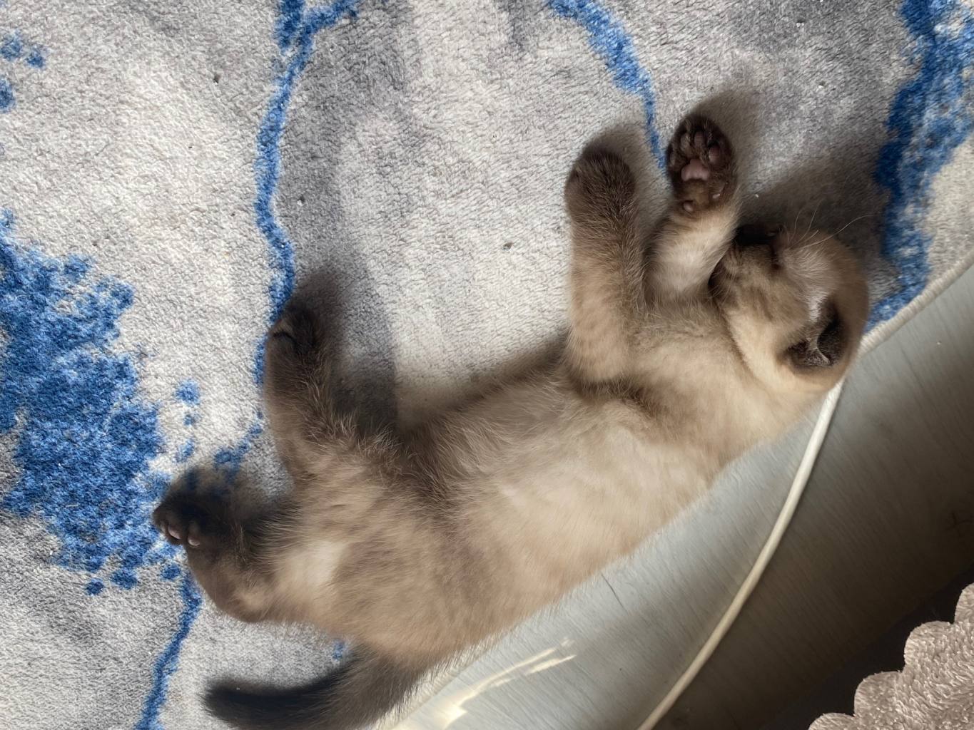 İki aylık, karakteristik gri-mavi kulak yapısına sahip, tam bir ev neşesi.