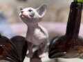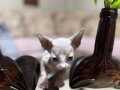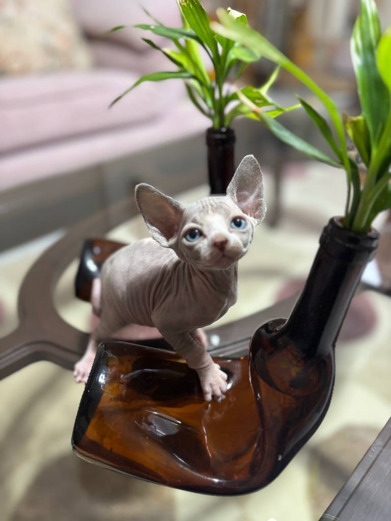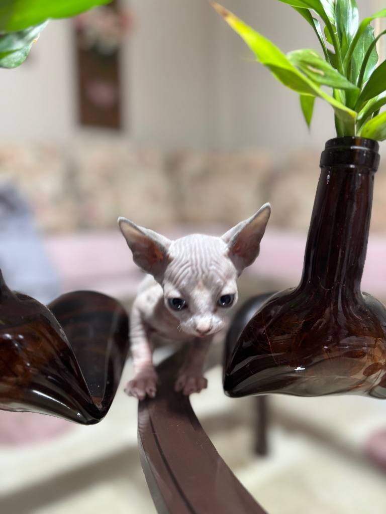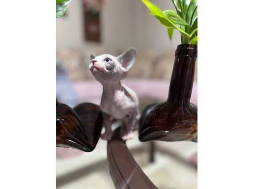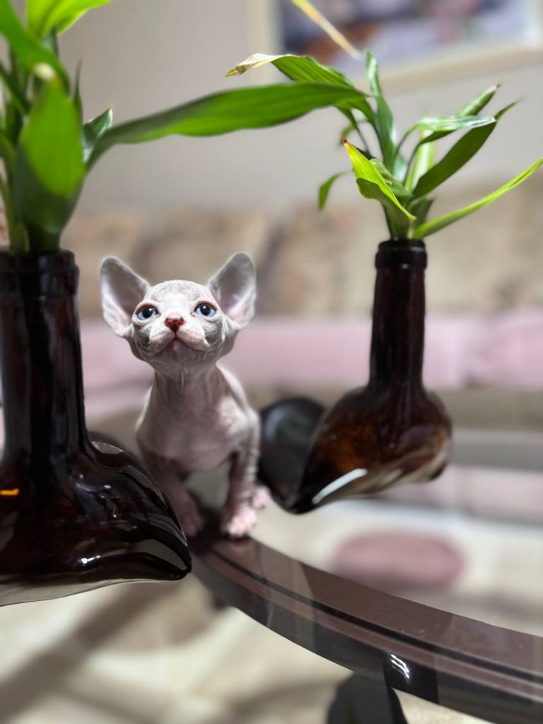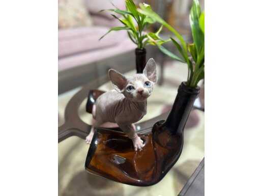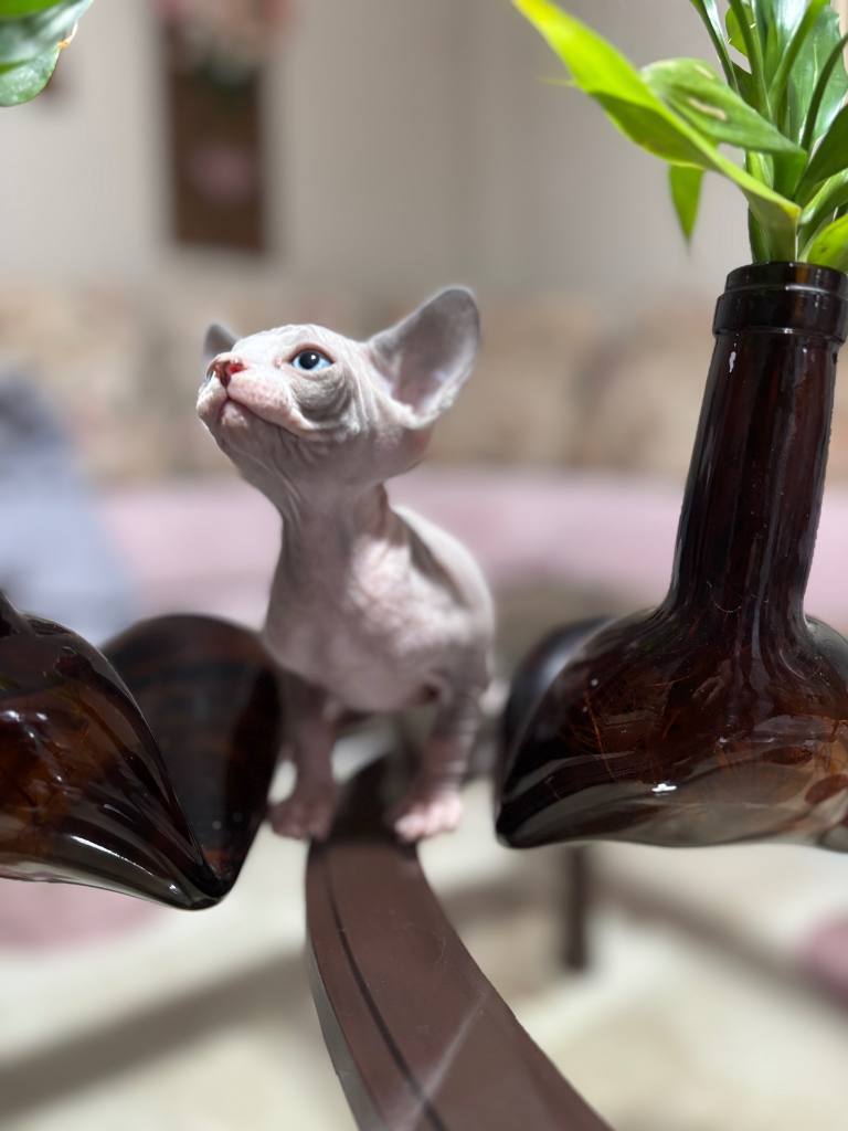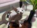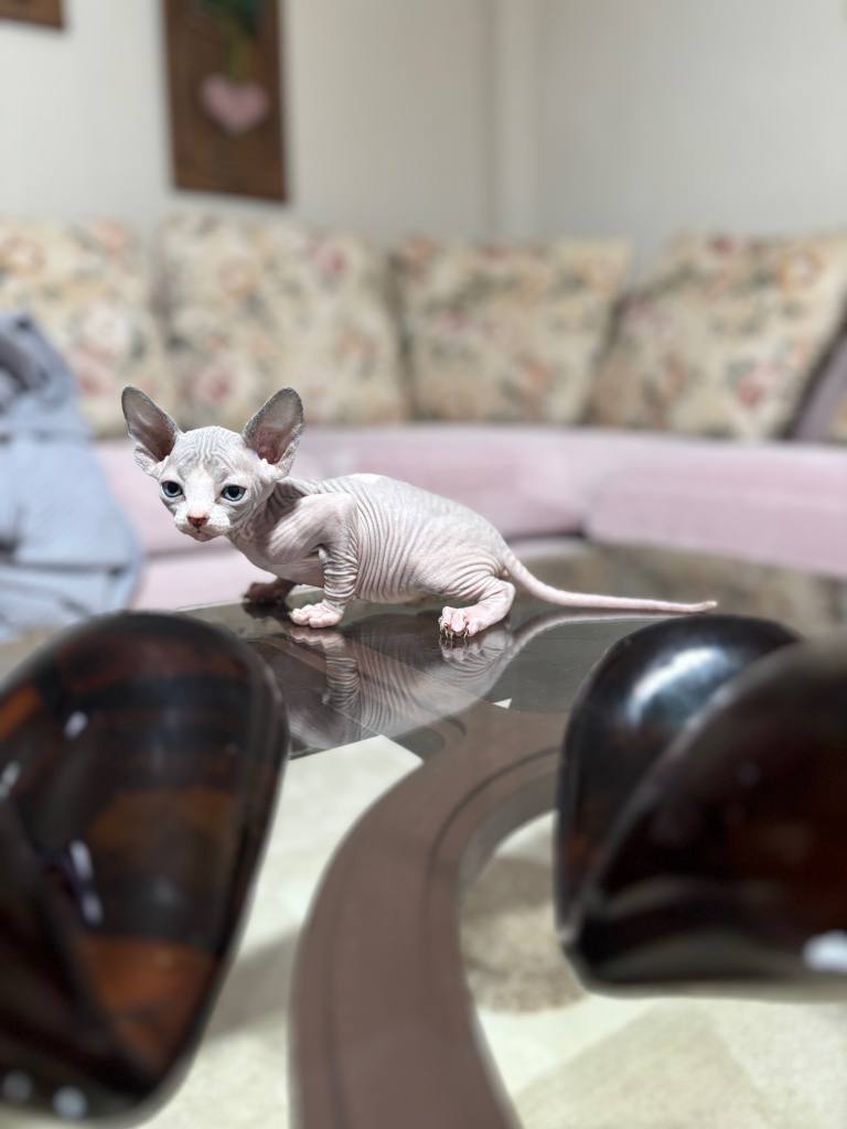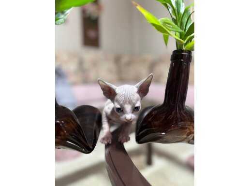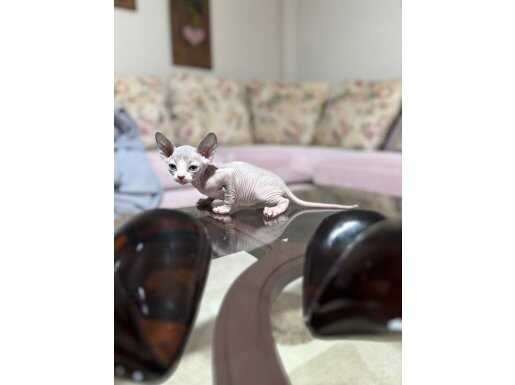 Bir hafta önce sütten kesilip kuru mamaya geçen 45 günlük erkek Sphynx yavrumuz, dev kulakları ve pürüzsüz teniyle tam bir görsel şölen.
