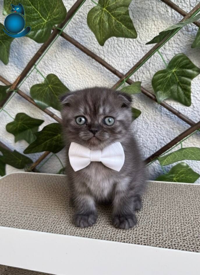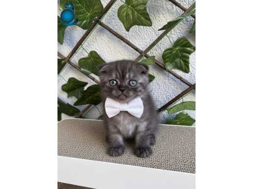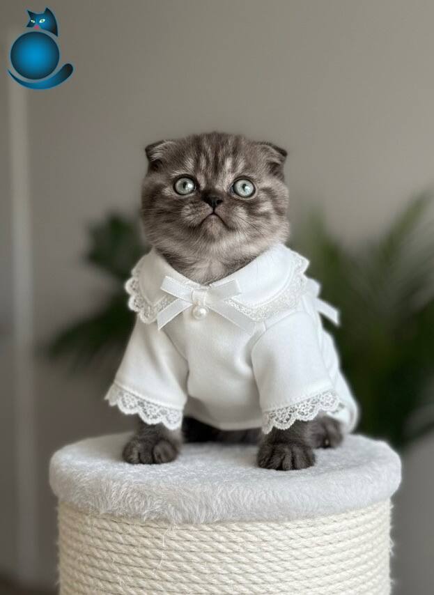Bakmaya kıyamayacağınız nadide bir elmas olan yeşil gözlü kırık kulak Scottish Fold yavrumuz şık kıyafetleri içinde sizin için poz veriyor.
