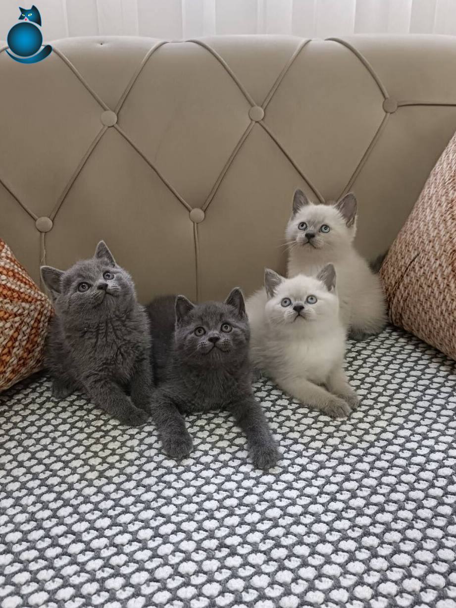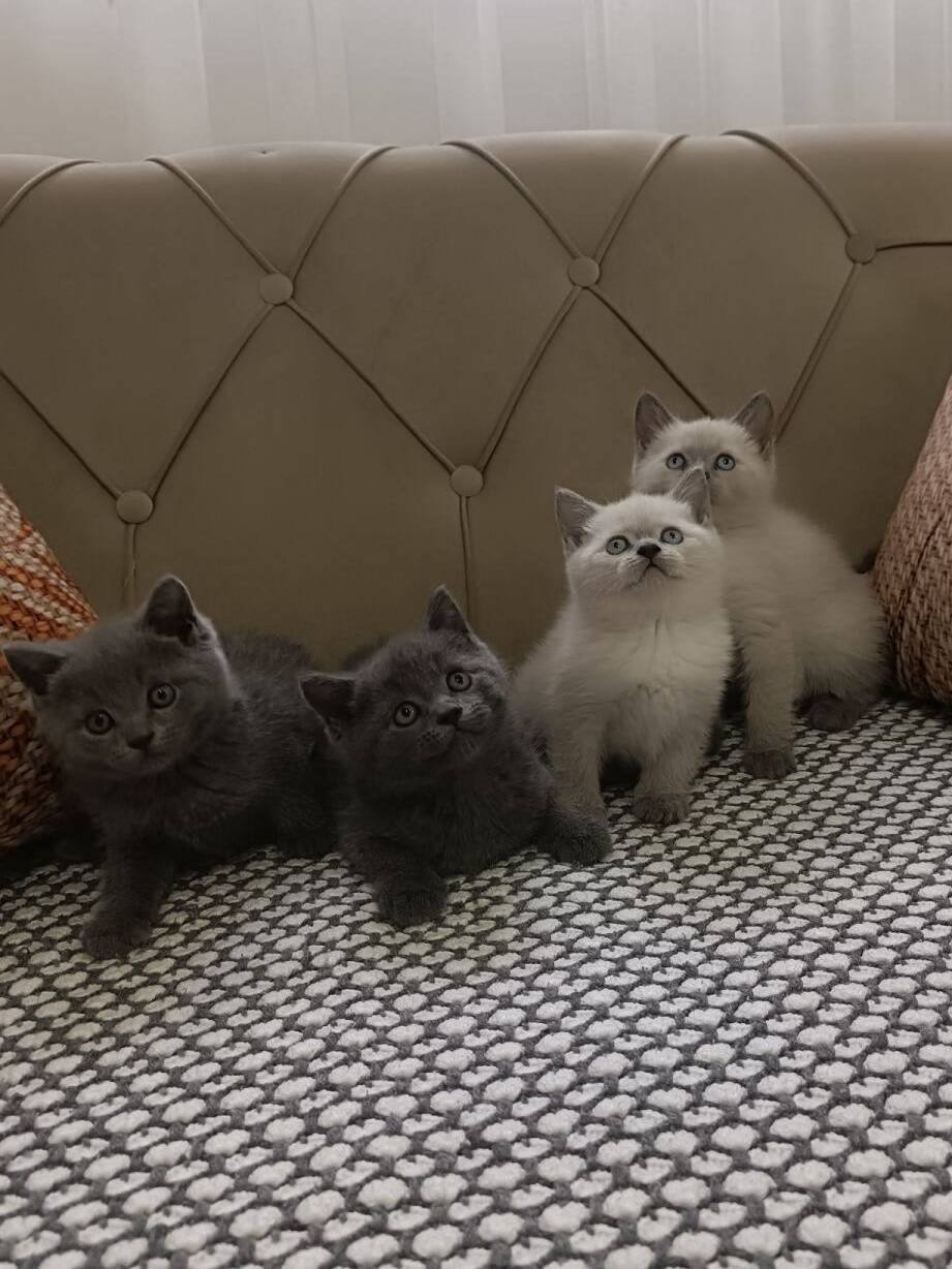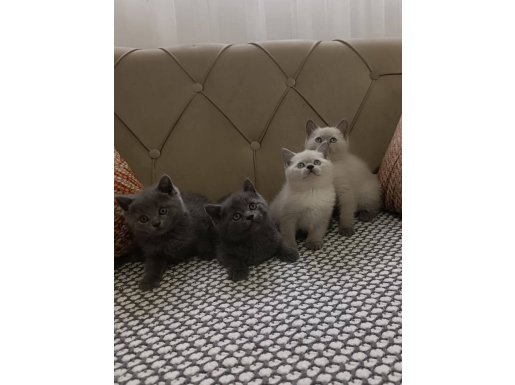 Gümüş parıltılı kadife postuyla 2 aylık gürbüz British Shorthair yavrular.