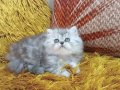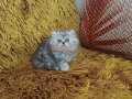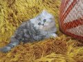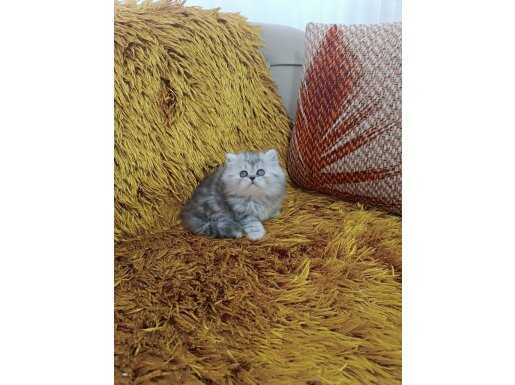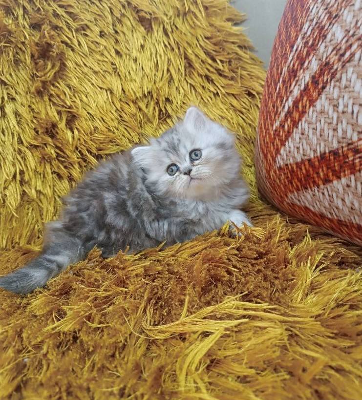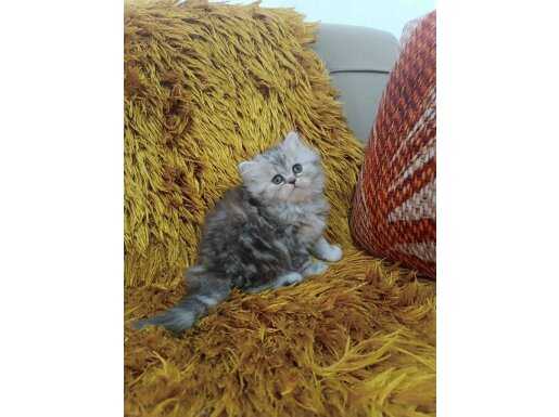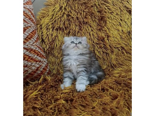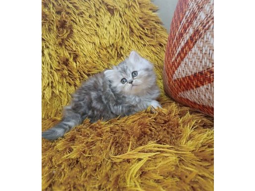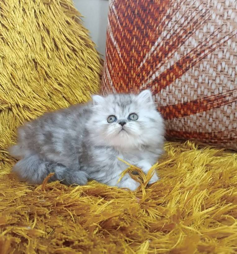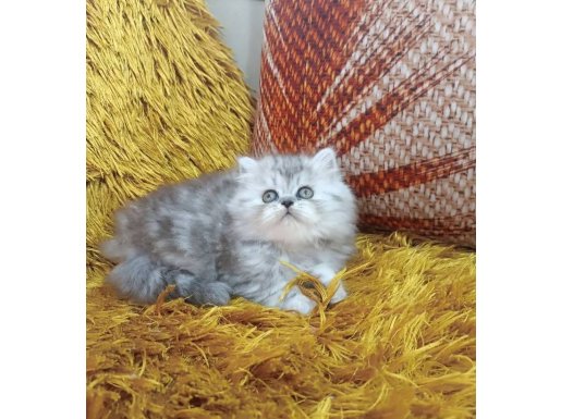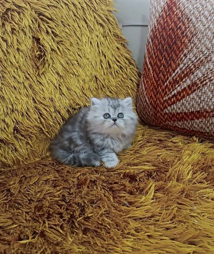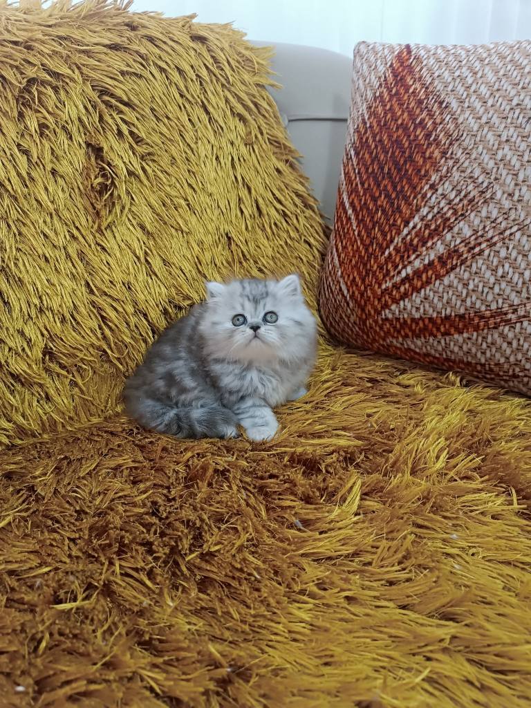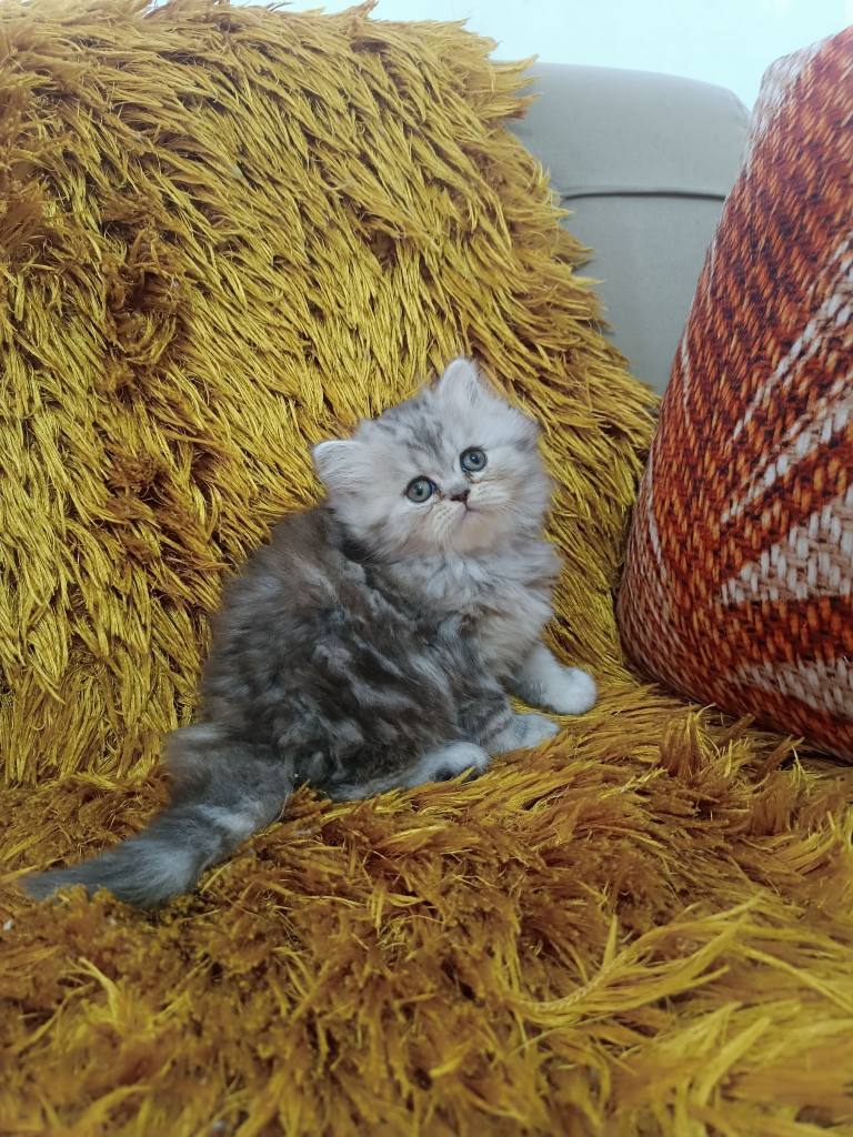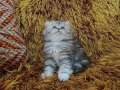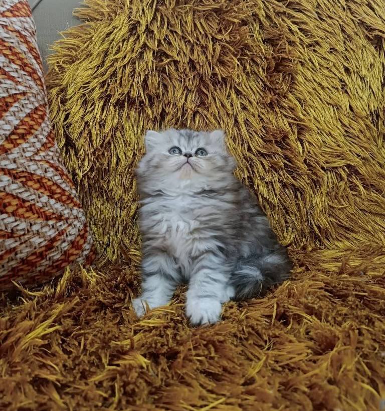 Gümüş harelerle süslü bu British Longhair, iki aylık gelişimini mama ve tuvalet alışkanlığıyla tamamladı.