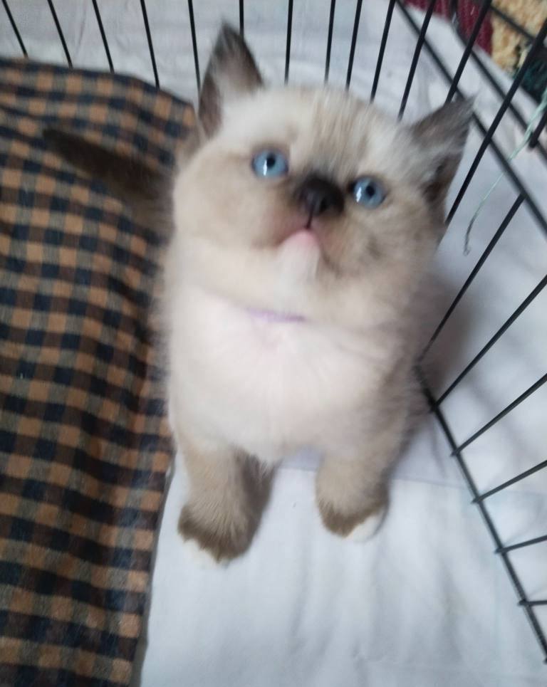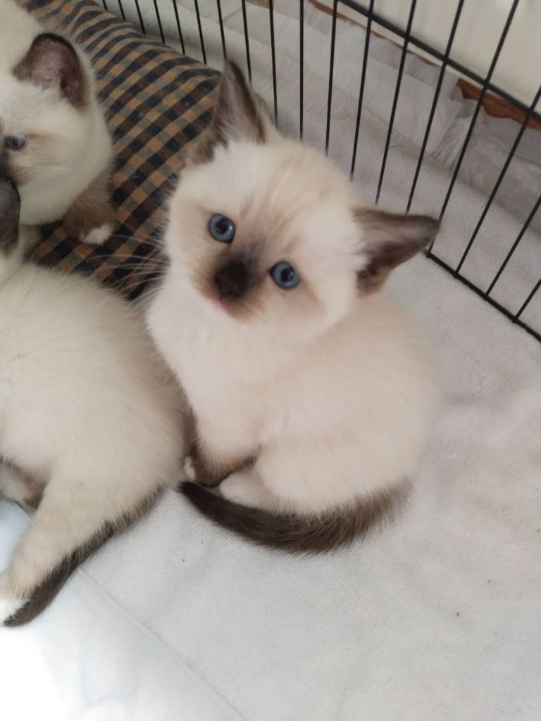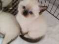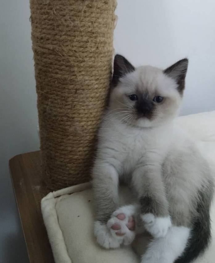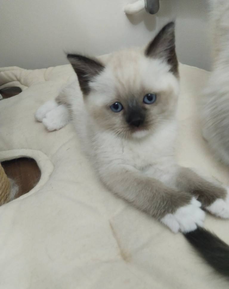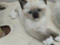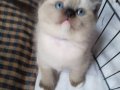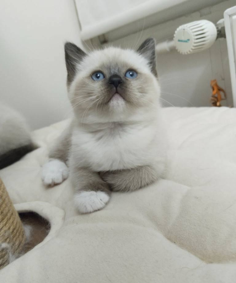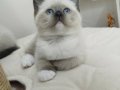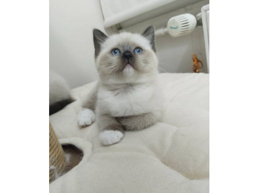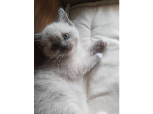 Ev ortamında sevgiyle büyüyen, mavi bakışlı British Shorthair Mitted Blue Point yavrularımız kuru mama yiyor.
