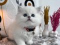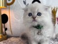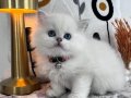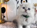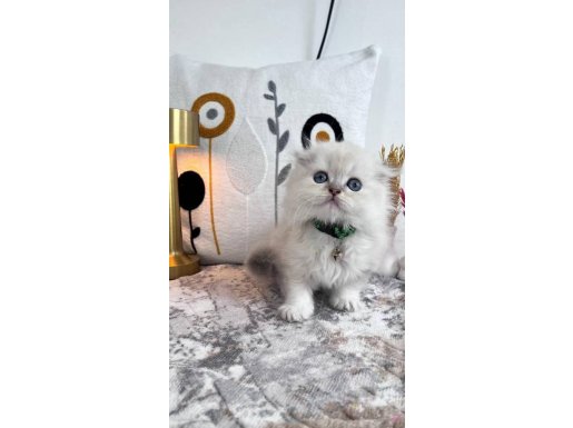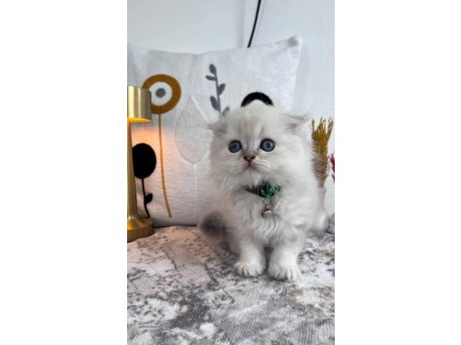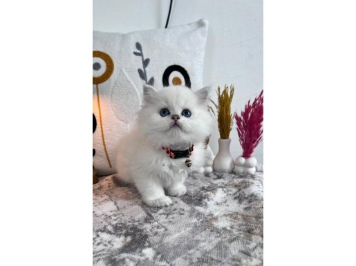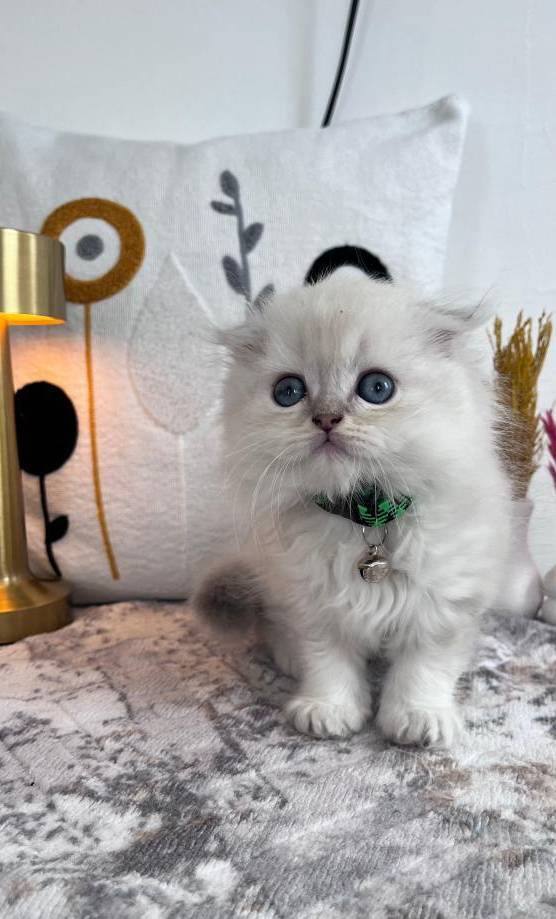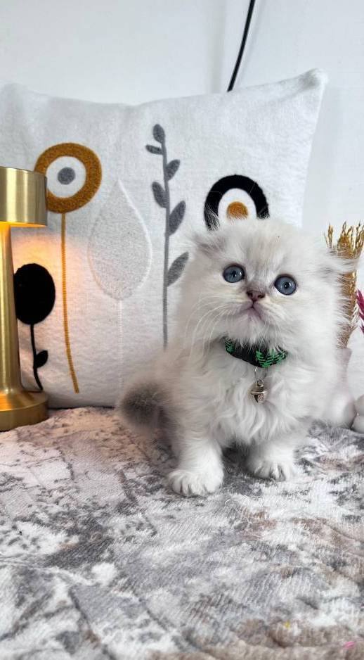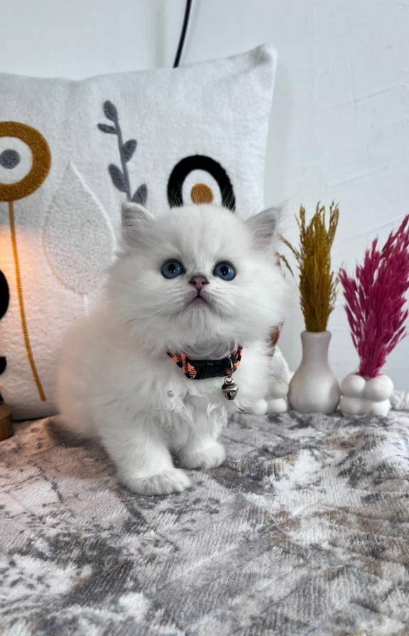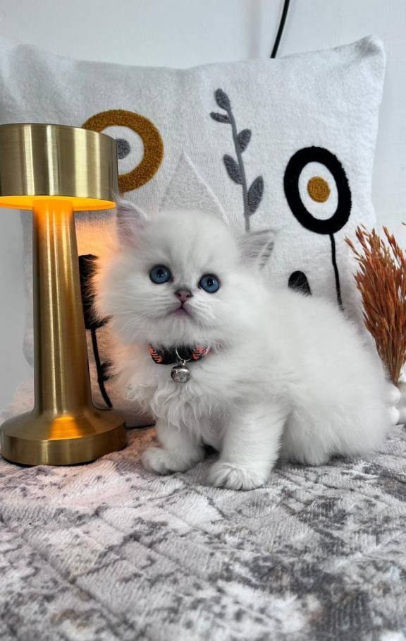 60 günlük, kuru mama ve tuvalet eğitimli bu British Longhair, ipeksi kar beyazı kürküyle adeta bir kar tanesi.
