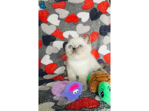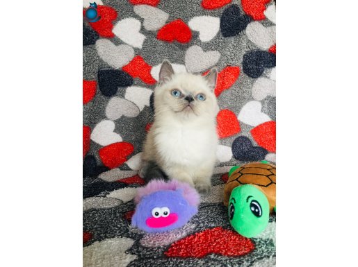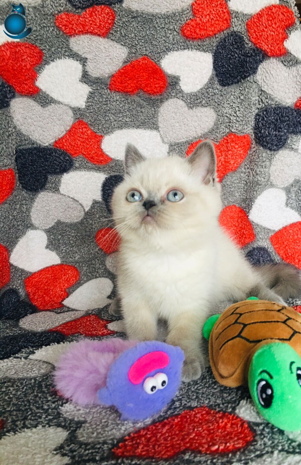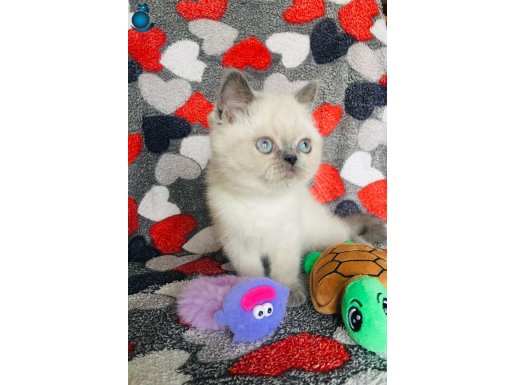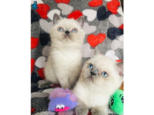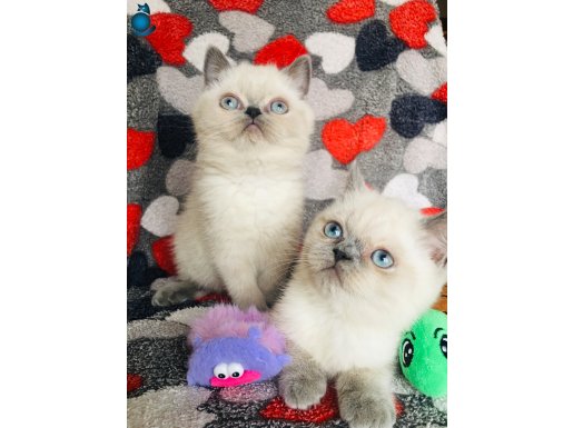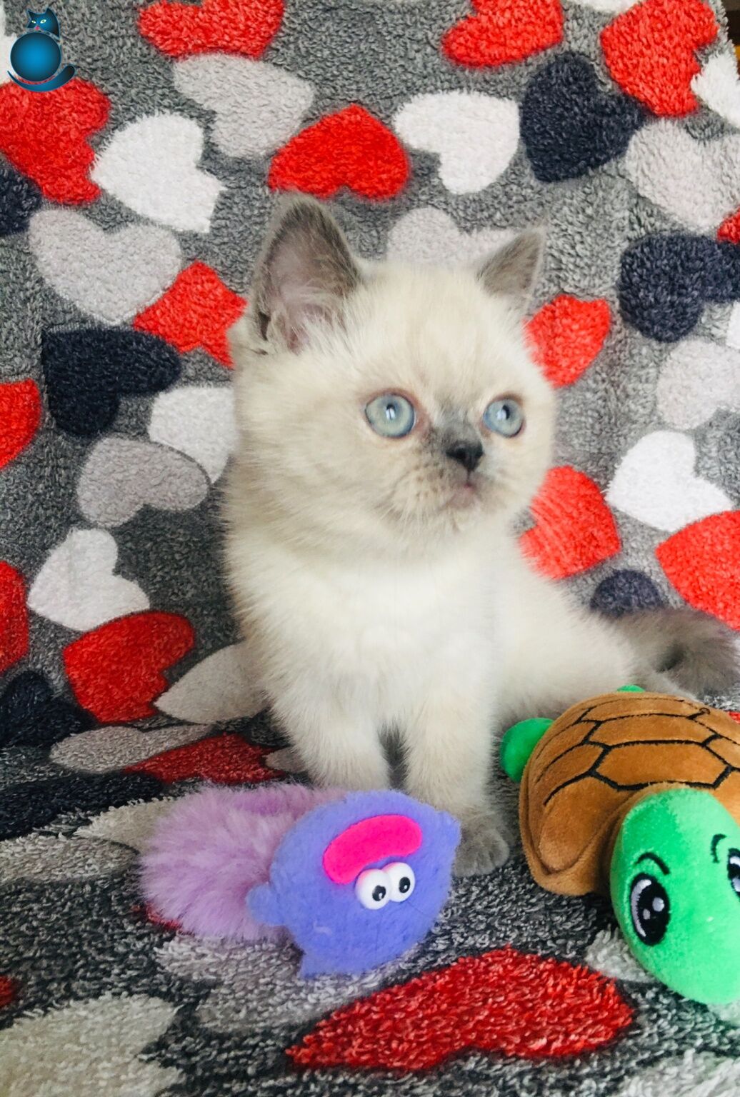 2 aylıktan küçük bu oyuncu British Shorthair yavrular, ipeksi beyaz kürküyle kontrast oluşturan karakteristik kulak ve kuyruk renkleriyle dikkat çeken, sakin mizaçlı ve sosyal karakterli gerçek birer ev arkadaşıdır.
