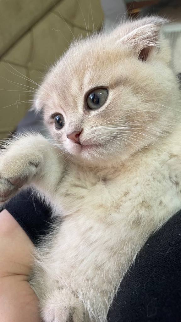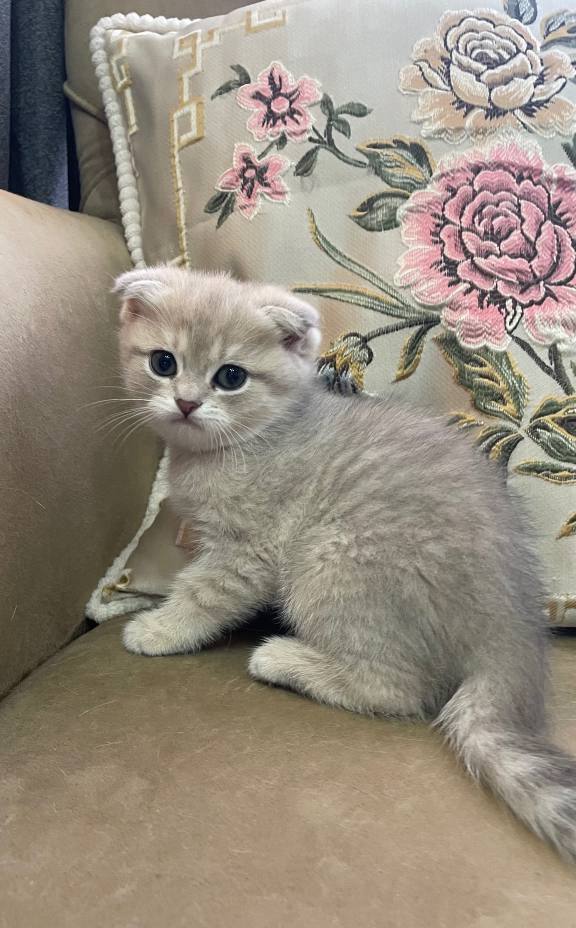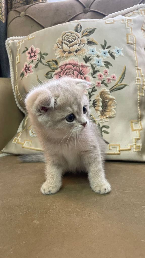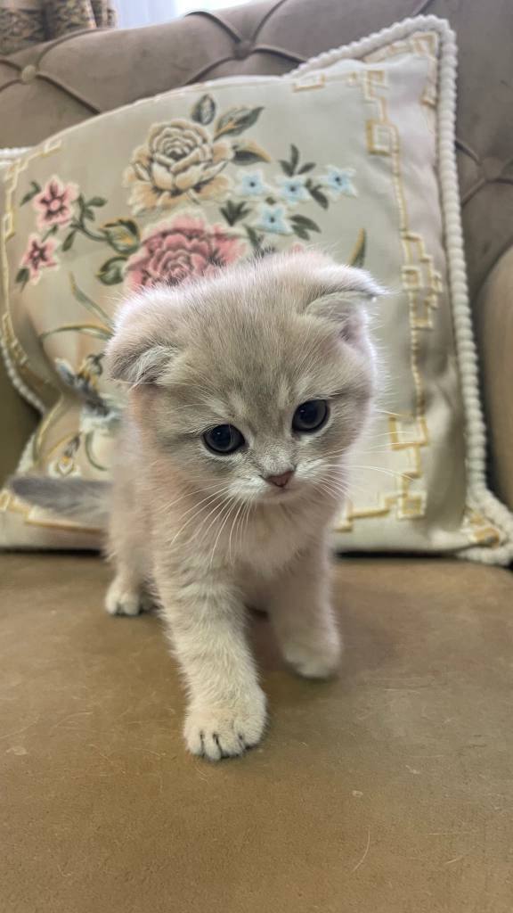 2 aylık, gümüş parıltılı bu Scottish Fold prenses, hayatınıza kadifemsi bir neşe katmaya hazır.