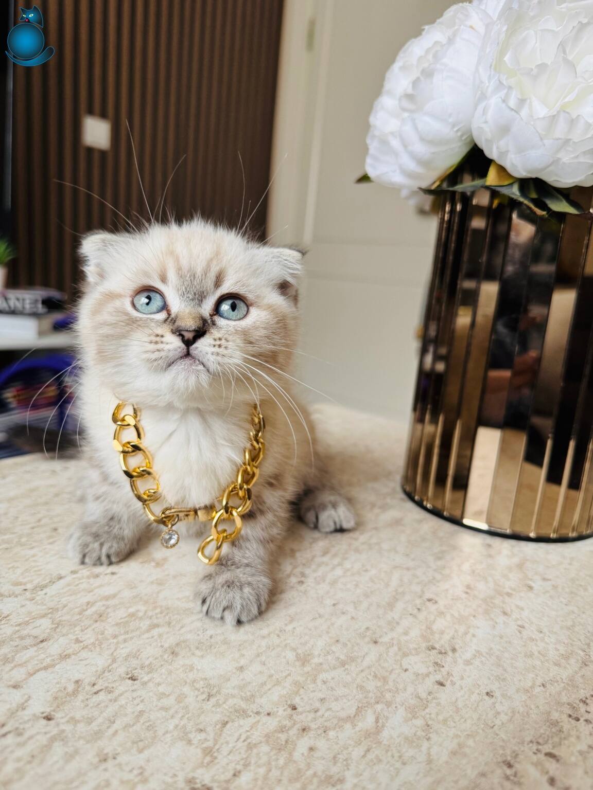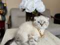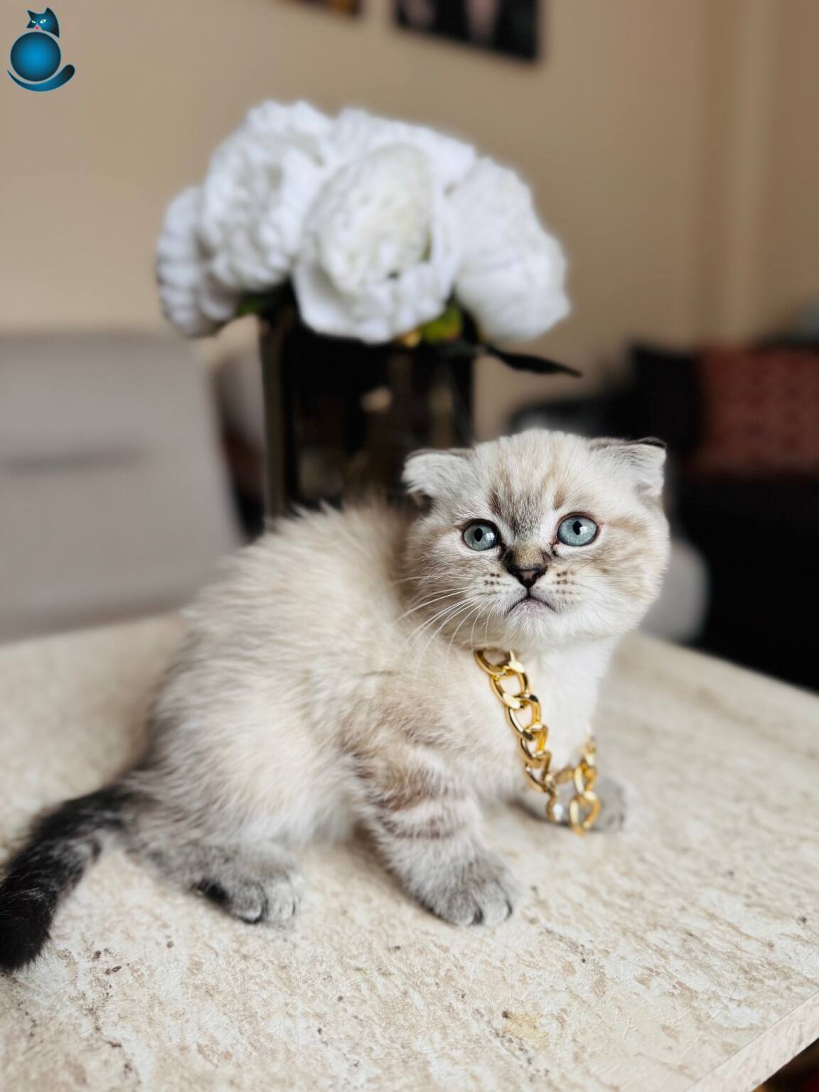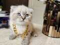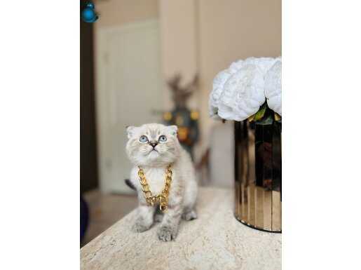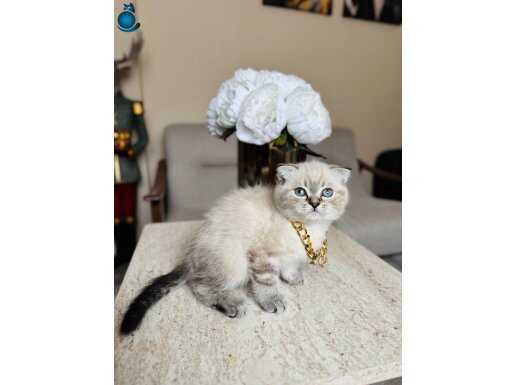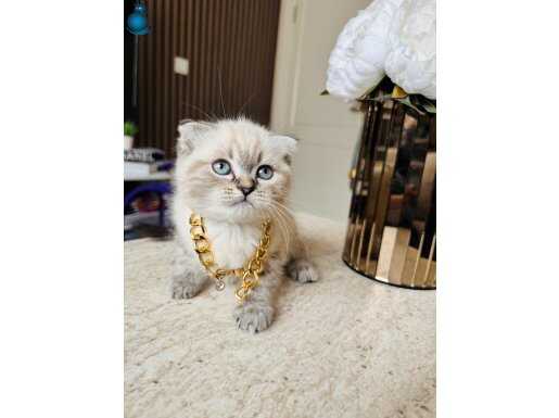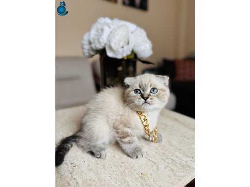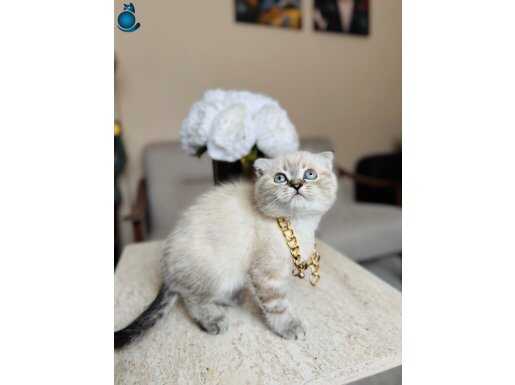 Karakteristik Lynx Point desenleri ve masmavi bakışlarıyla büyüleyen 2 aylık Scottish Fold yavrularımız yeni yuvalarını bekliyor. Boyunlarındaki gold detaylı aksesuarla asaletini sergileyen bu minikler, kuru mamaya geçmiş olup tuvalet eğitimlerini başarıyla tamamlamış durumdadır.