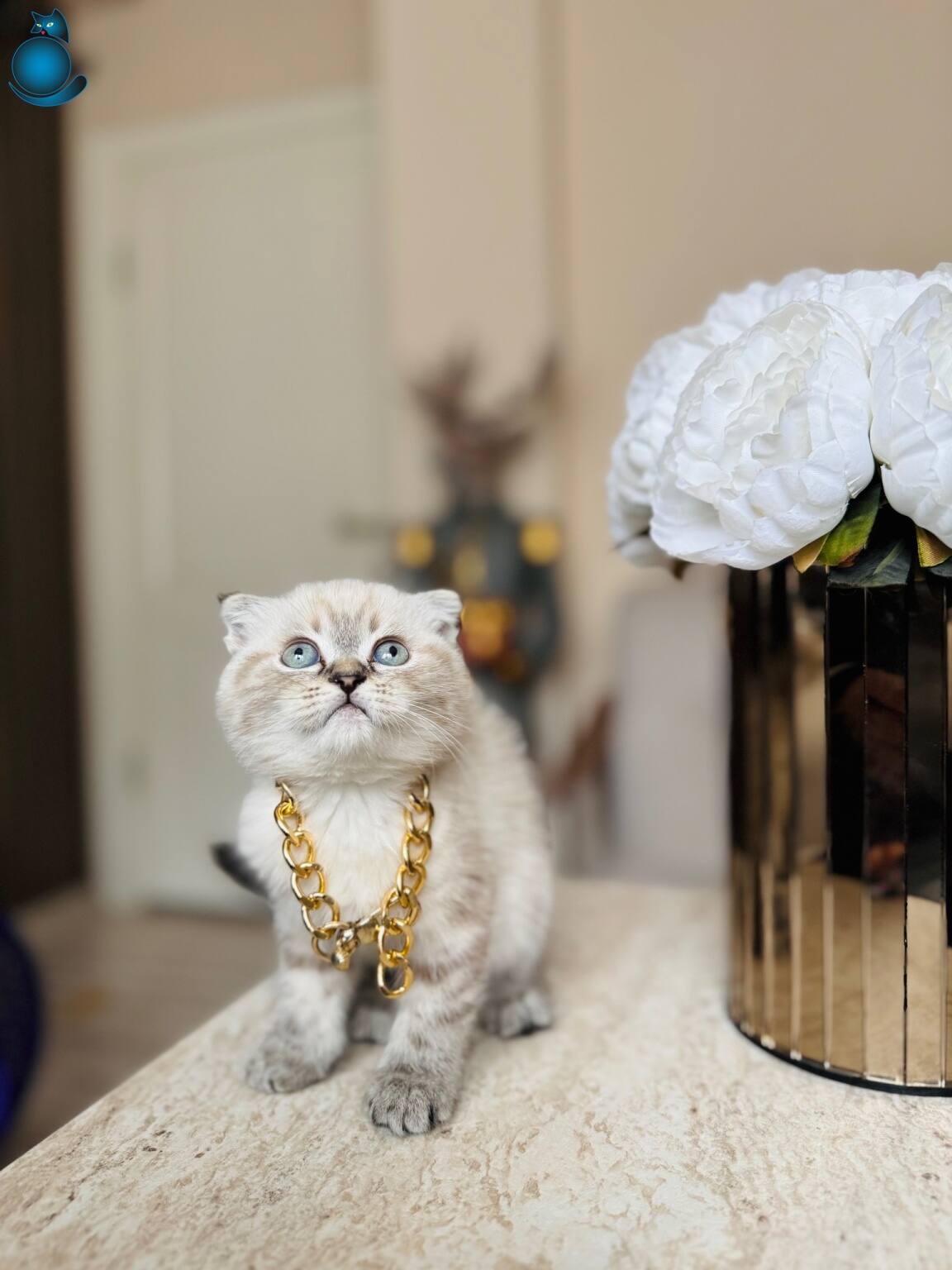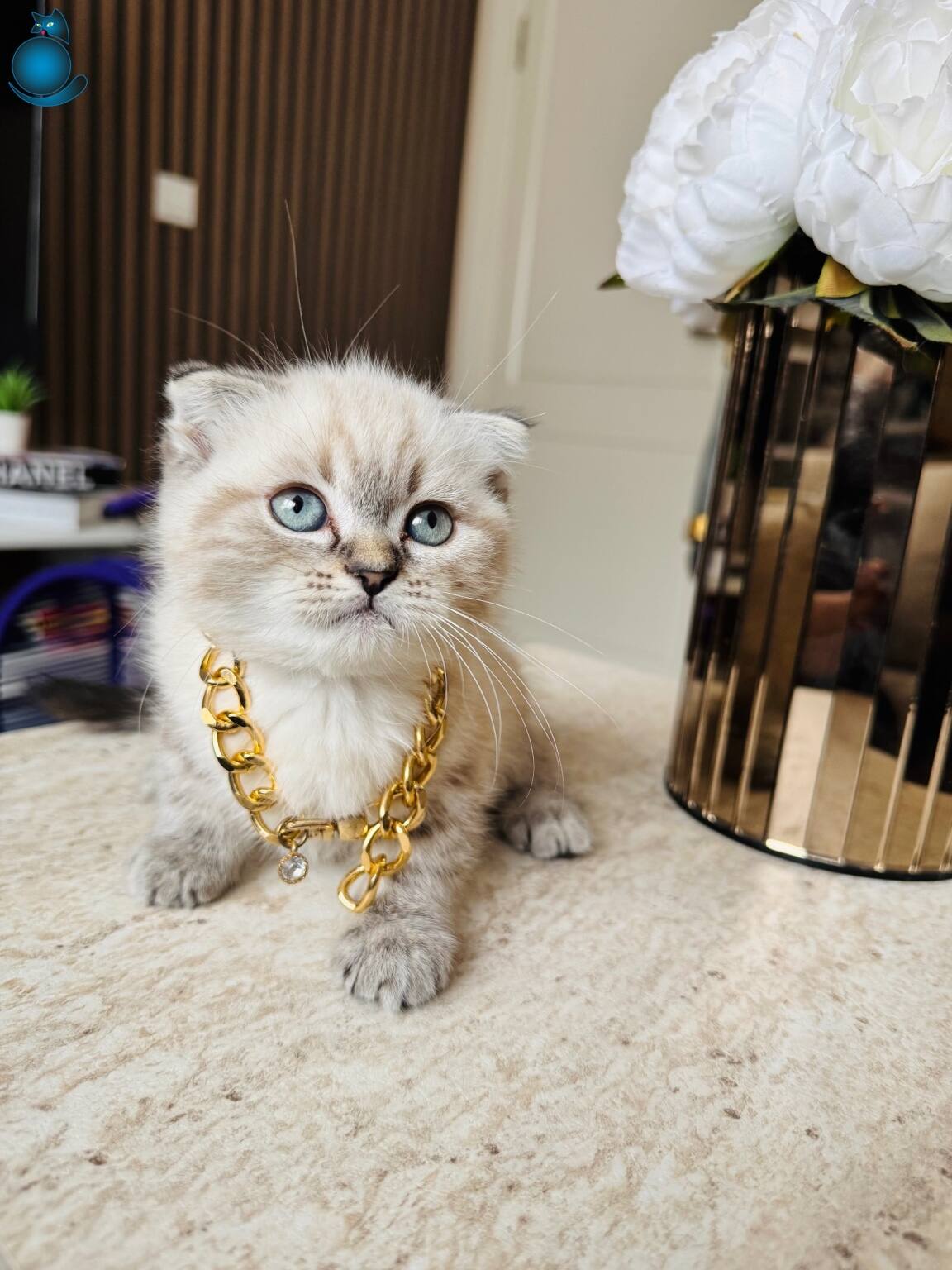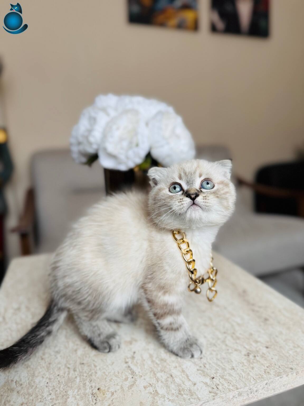 Karakteristik Lynx Point desenleri ve masmavi bakışlarıyla büyüleyen 2 aylık Scottish Fold yavrularımız yeni yuvalarını bekliyor. Boyunlarındaki gold detaylı aksesuarla asaletini sergileyen bu minikler, kuru mamaya geçmiş olup tuvalet eğitimlerini başarıyla tamamlamış durumdadır.