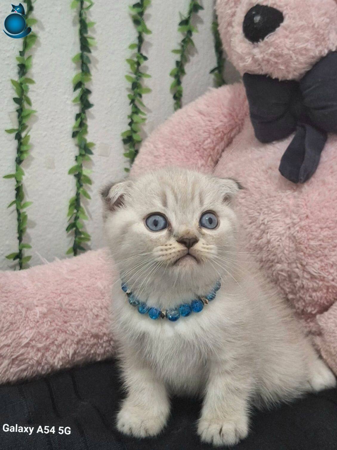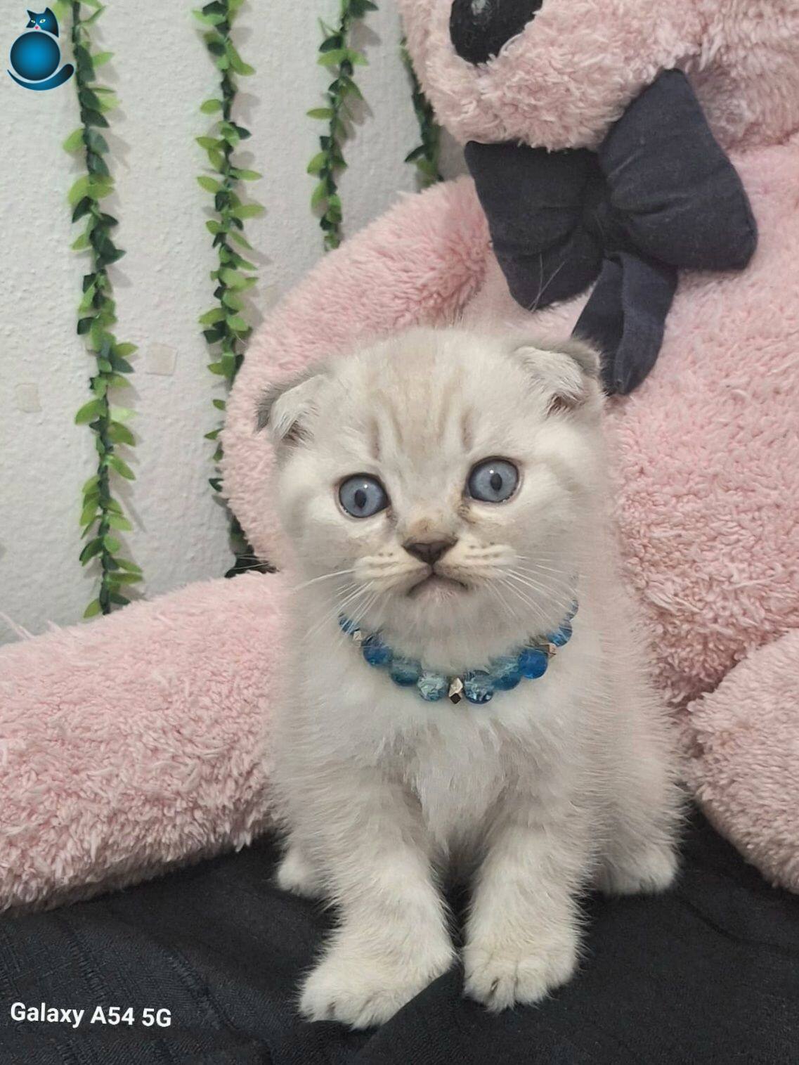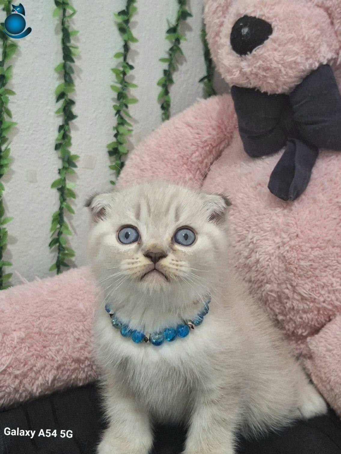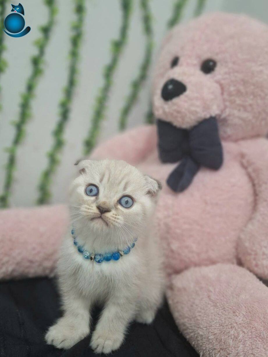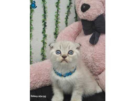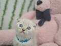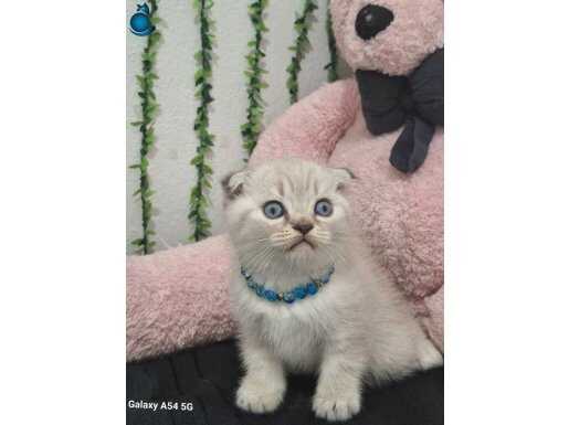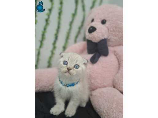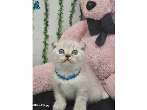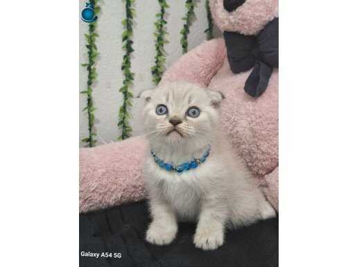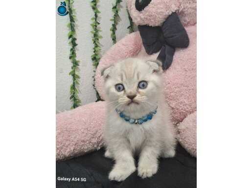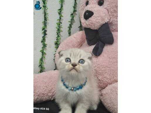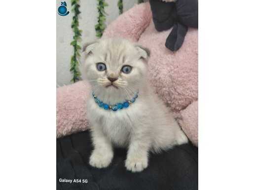 Muhteşem gözlere sahip maviş kırık kulak Scottish Fold yavrumuz harikulade tüy rengi ile göz kamaştırıyor.