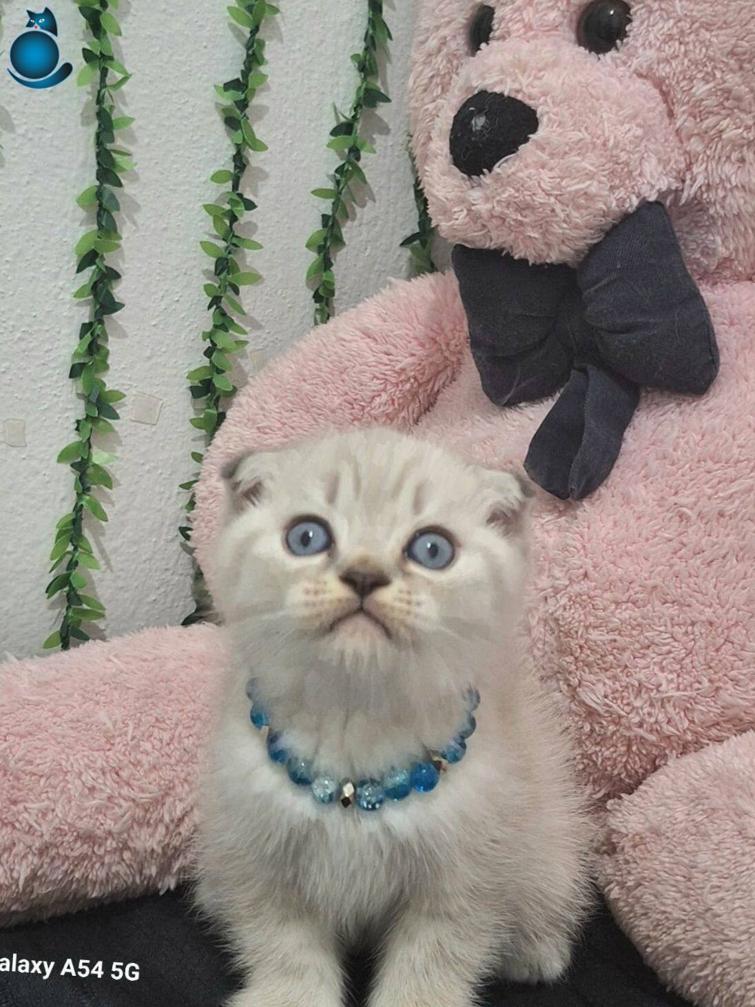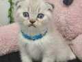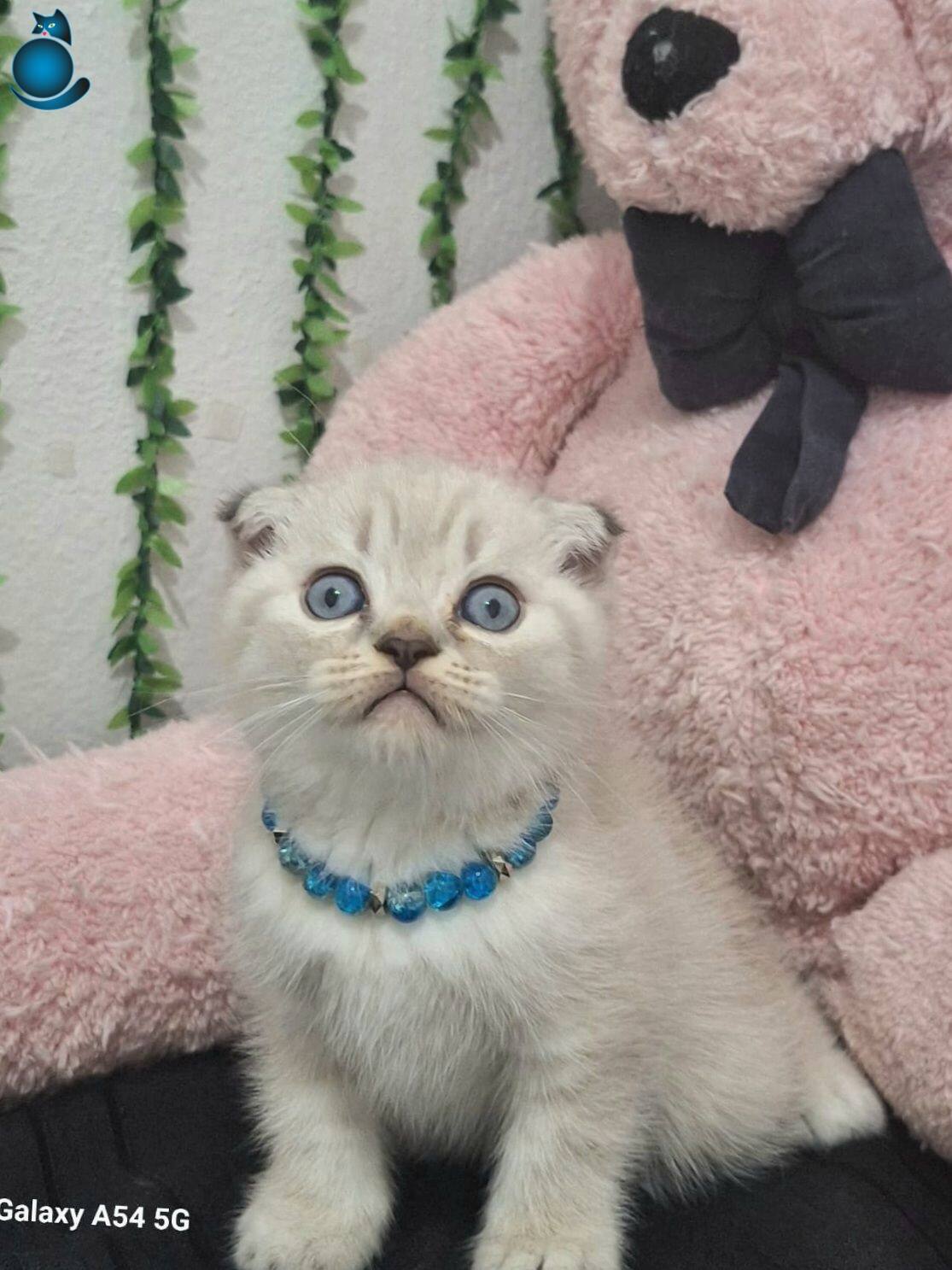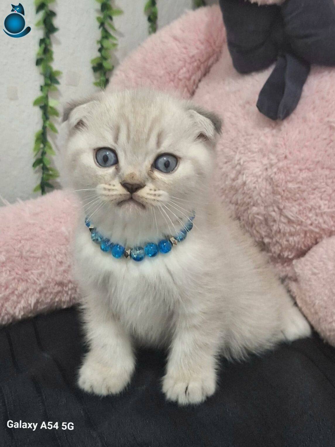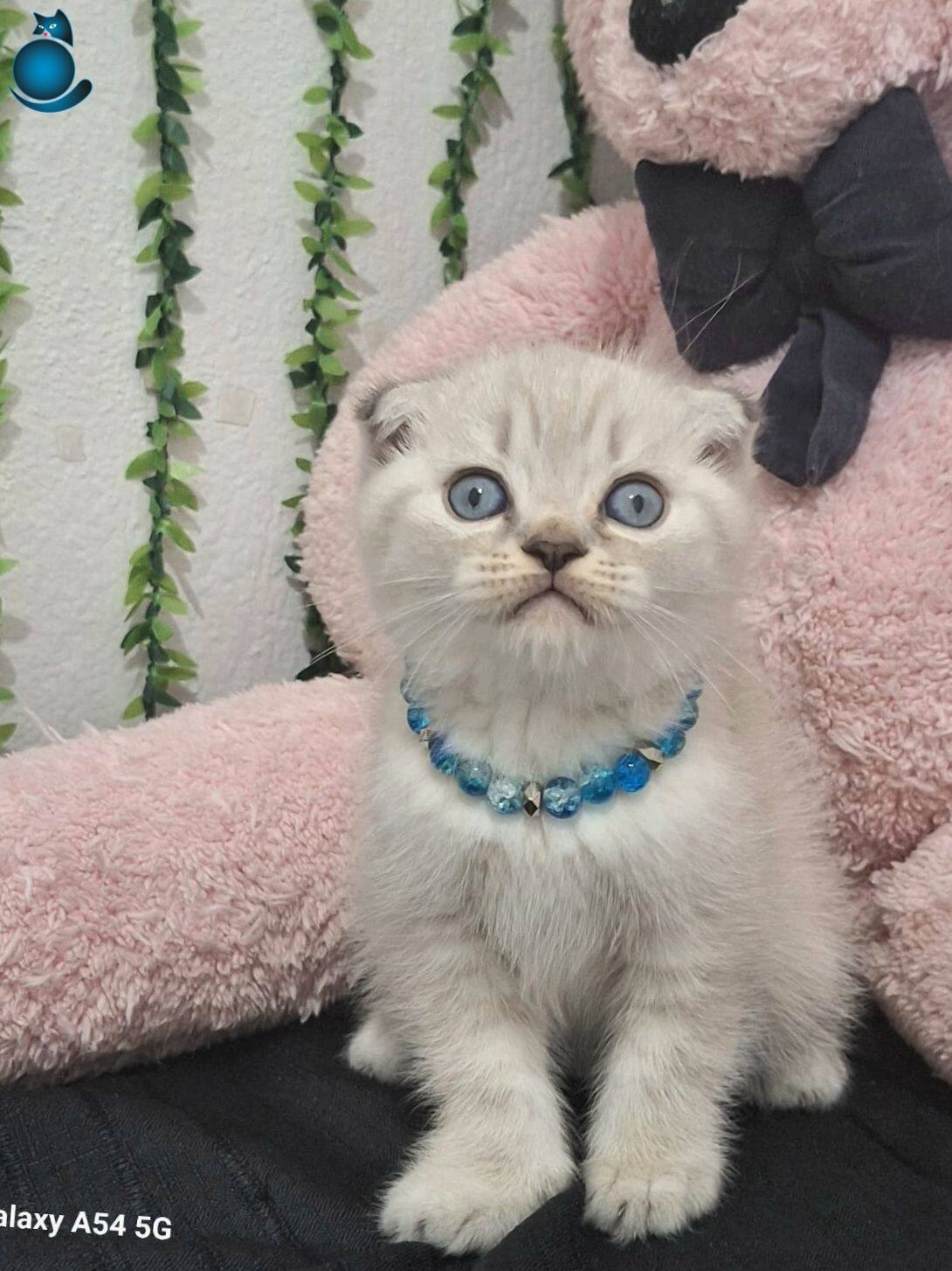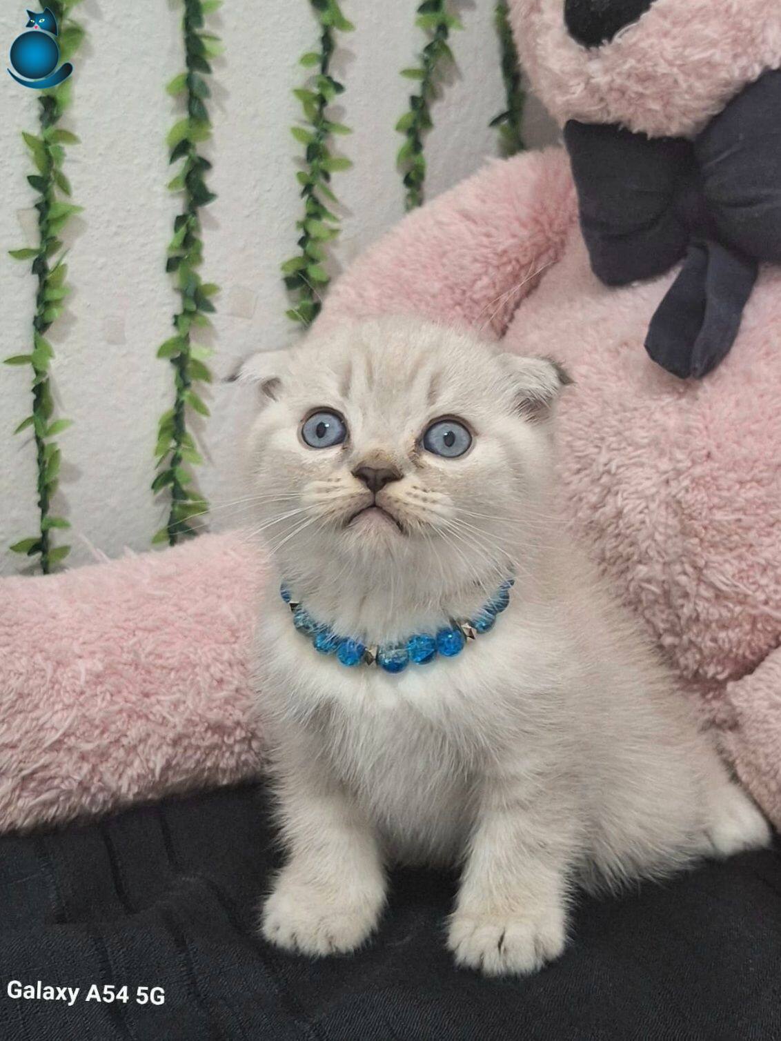 Muhteşem gözlere sahip maviş kırık kulak Scottish Fold yavrumuz harikulade tüy rengi ile göz kamaştırıyor.