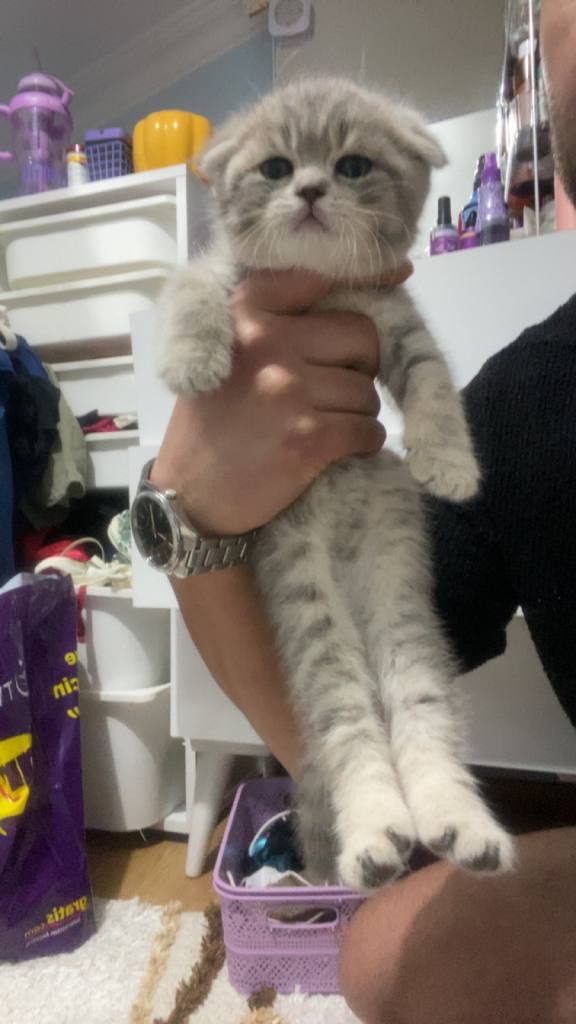 Sütten kesileli henüz bir hafta olan, minicik kulaklı, gümüş tüy yumağı Scottish Fold kızım yeni yuvasını bekliyor.
